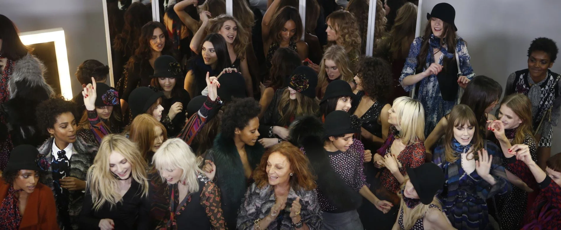 This season Karlie Kloss presented gold sequins full-length version of the wrap dress. The disco scenario reminded of "Studio 54" times Diane was so fond of back then. Models, friends and even designer herself danced to “We Are Family”. The room was full of attitude, gratitude and beautiful and confident women.