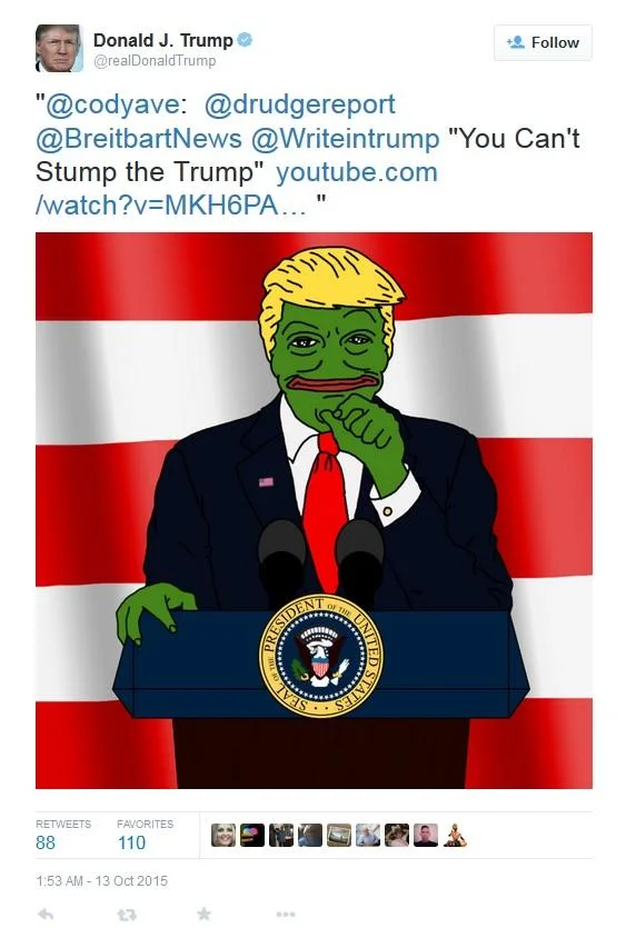 On October 13th, 2015, Donald Trump tweeted an illustration of Pepe as himself standing at a podium with the President of the United States Seal (shown below). Within 16 months, the post gathered upwards of 11,000 likes and 8,100 retweets.