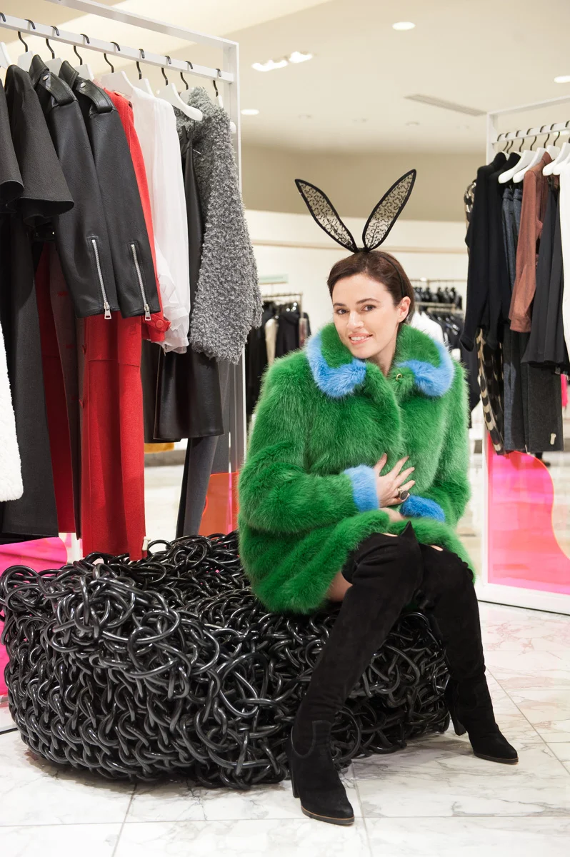 'Abatha' faux fur coat by Shrimps. Bunny ears headband by Maison Michel. Photo Lauri Levenfeld