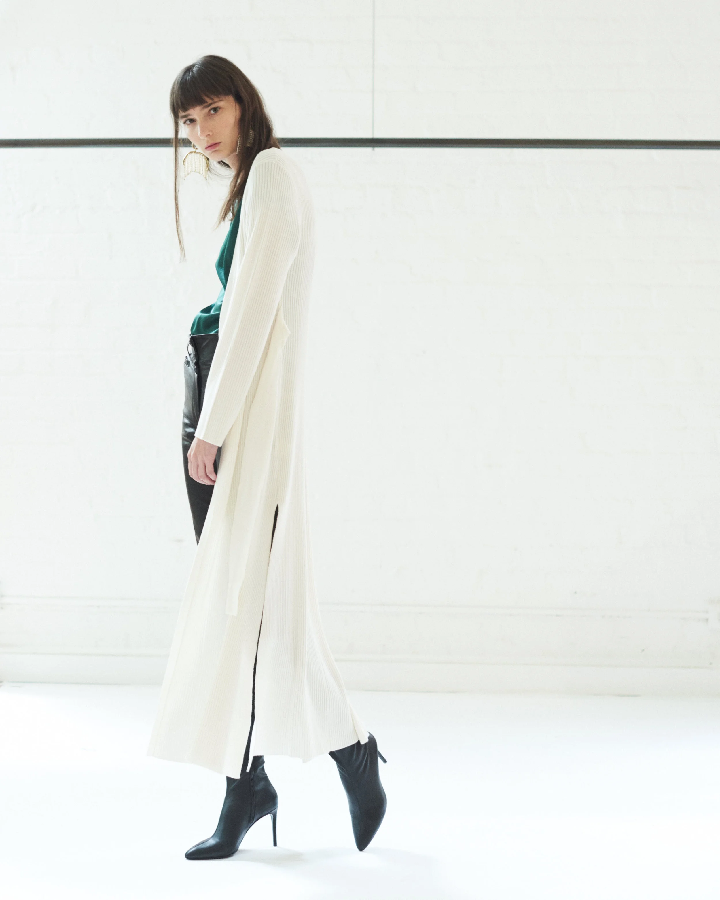 Ann Demeulemeester Leather Trousers $2060 + Osman Long Cardigan $700 + Cedric Charlier Blouse $495, Ellery Emin Fringe Earrings $850