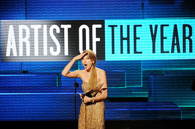 Taylor Swift gives her signature surprised expression after winning a trophy at the 2011 American Music Awards.