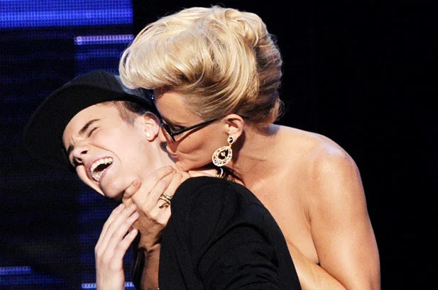 Presenter Jenny McCarthy plants a playful kiss on winner Justin Bieber as he accepts the award for Favorite Pop/Rock Album at the 2012 AMAs.